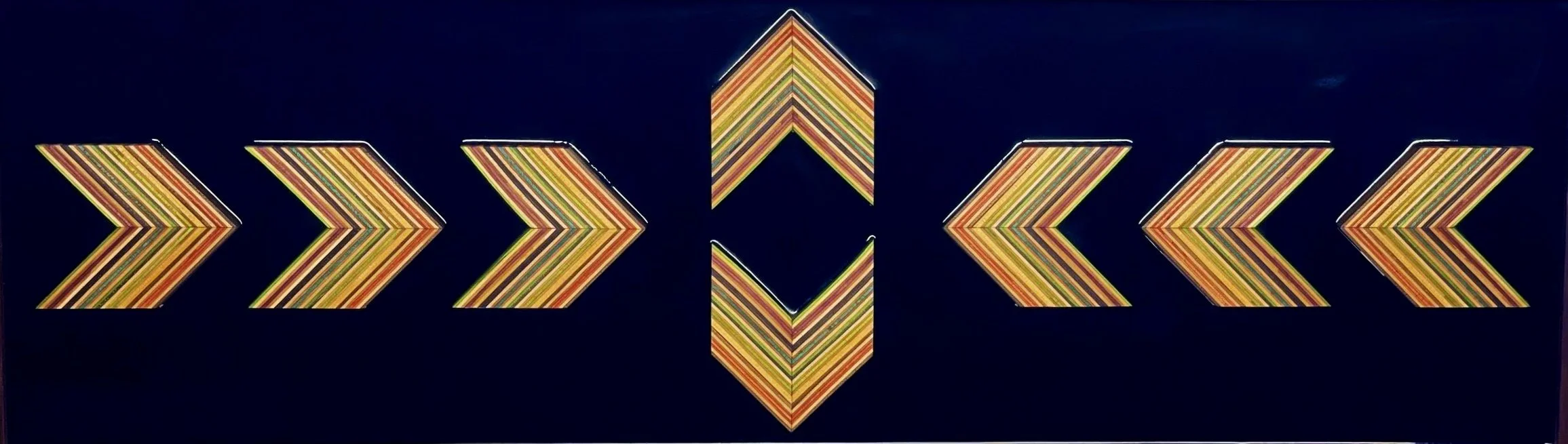 Original geometric Pattern with a recycled skateboard deck back drop.